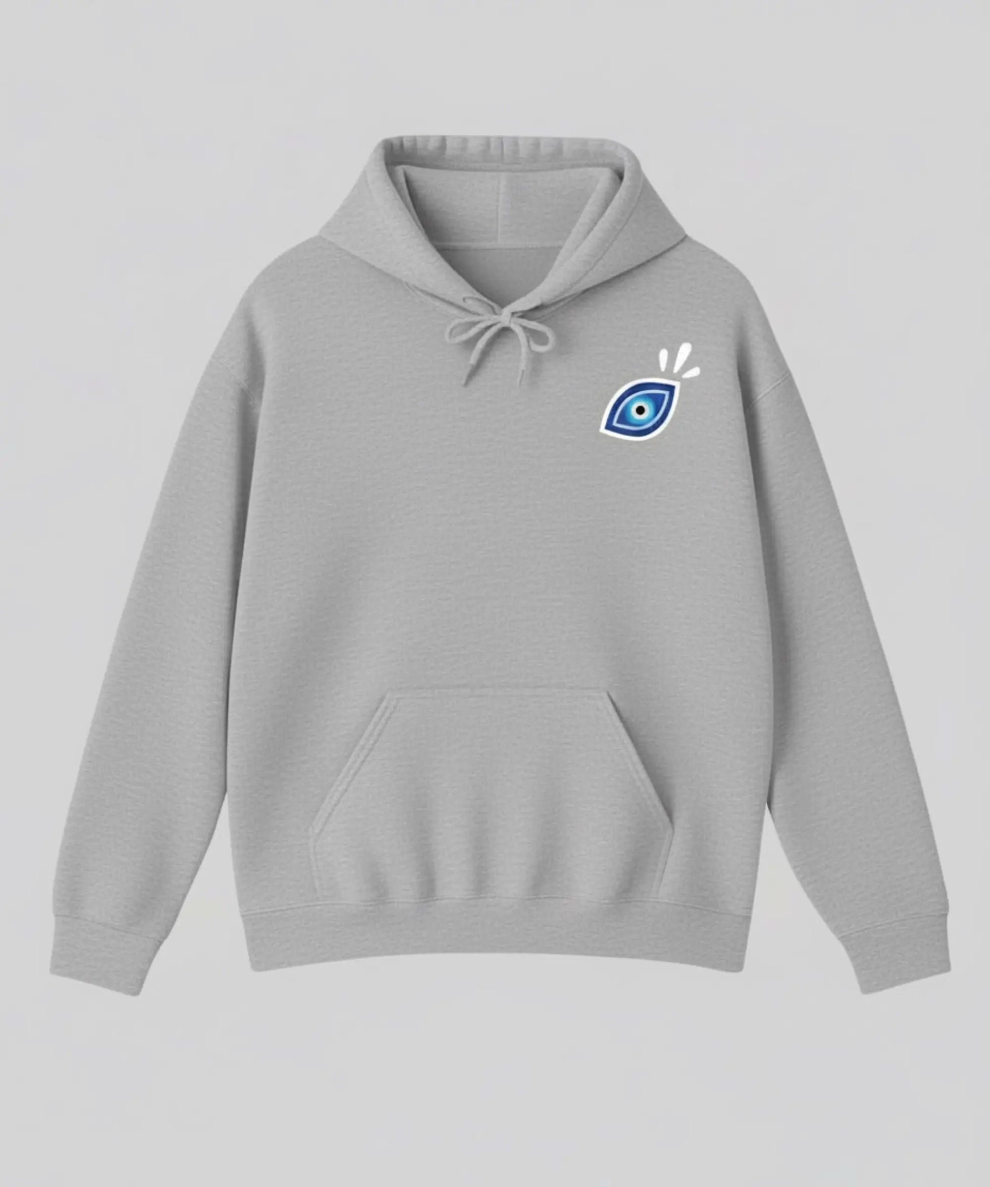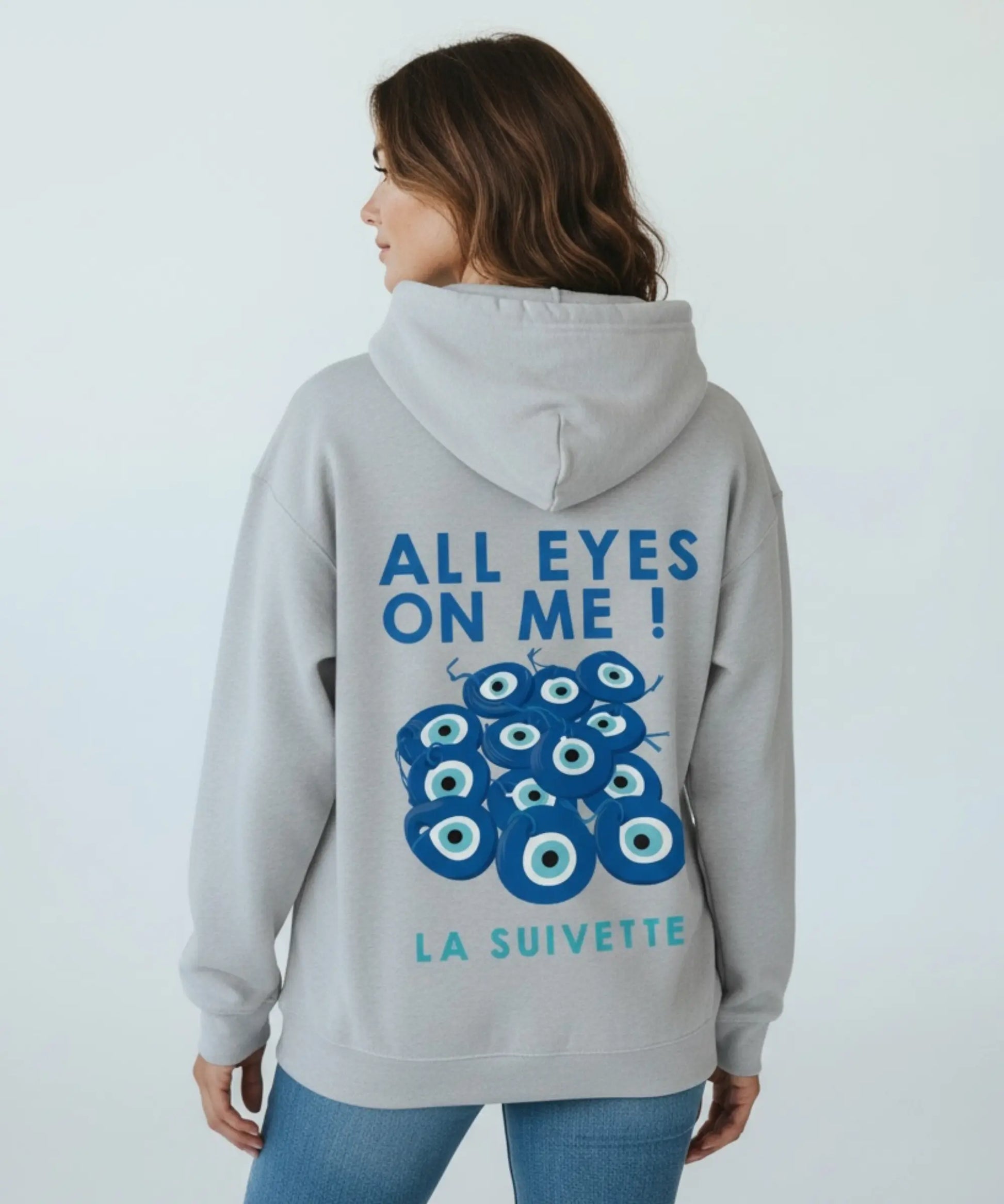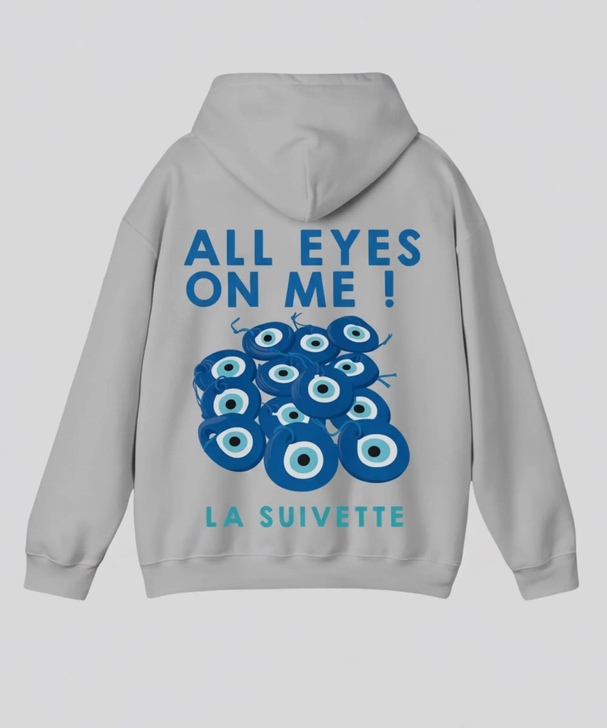 Le gris clair est la couleur du calme, mais le message est puissant. Le dos de ce sweat à capuche premium arbore fièrement le design iconique des yeux protecteurs bleus sous la bannière "ALL EYES ON ME !". Le fond gris neutre permet au motif de protection de se démarquer avec élégance, offrant un contraste à la fois doux et saisissant.
